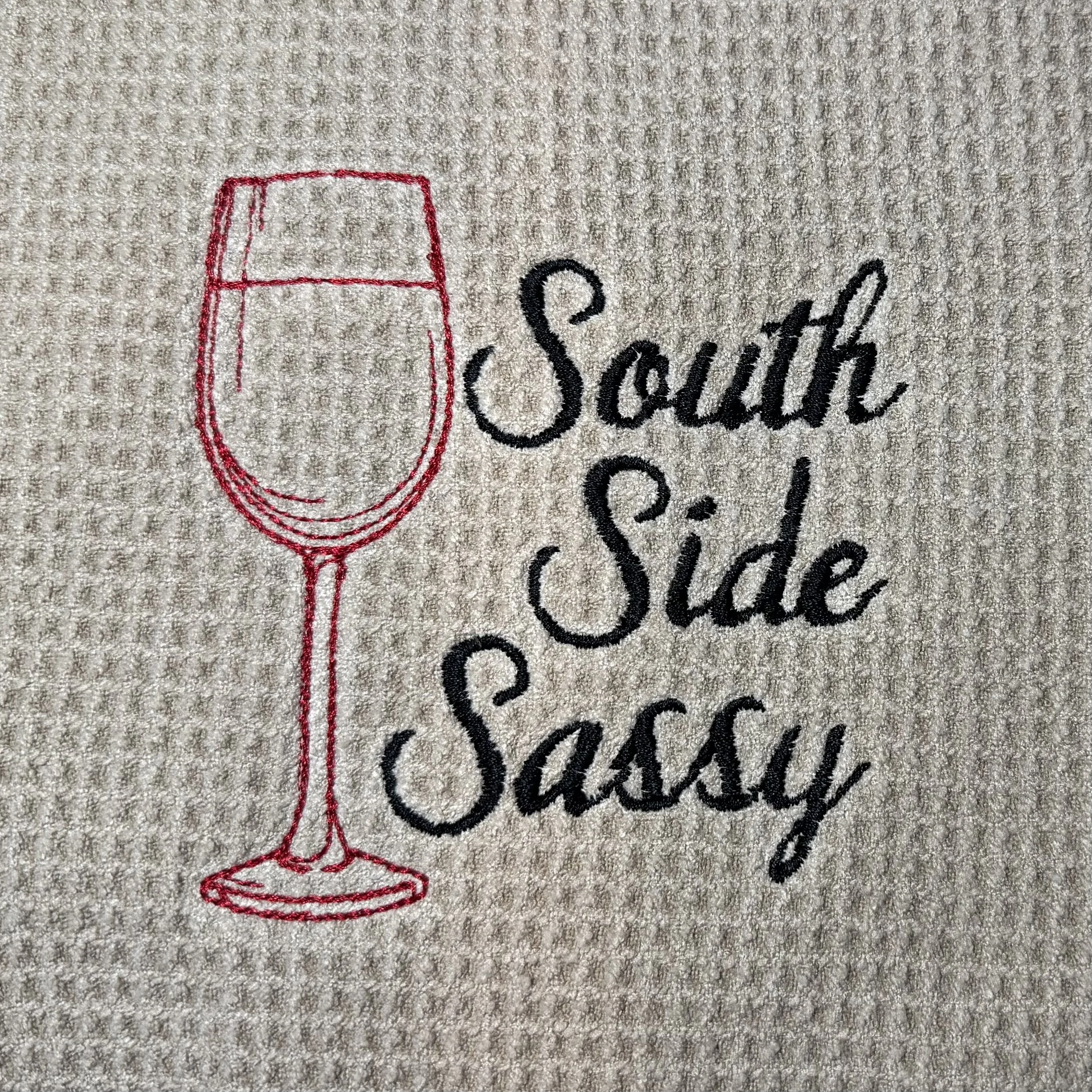 Microfiber Towel - “South Side Sassy” and a wine glass in red and black embroidery on a tan microfiber towel ($20 microfiber + $6 custom design)